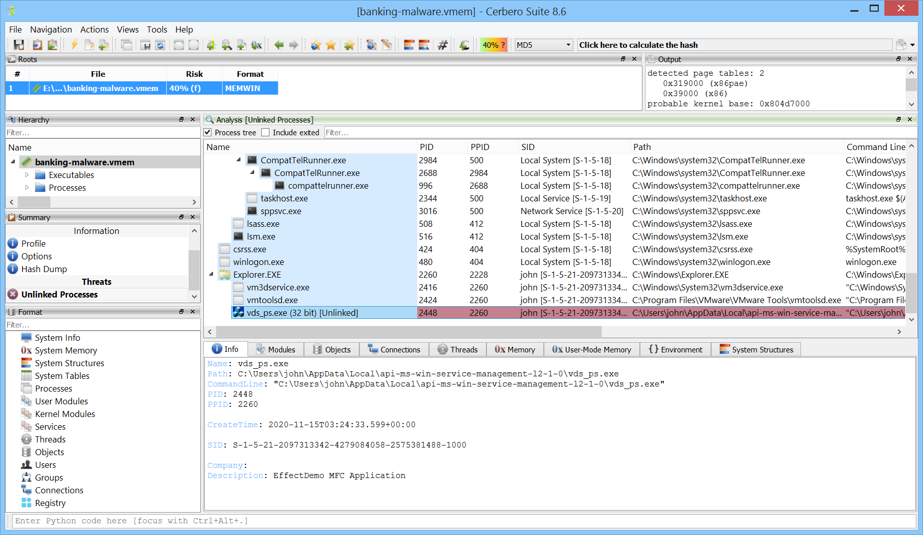 Unlinked processes may appear as artifacts of dumping a live system or as a deliberate technique used by malware to hide from process listings. In the image below, you can see a malicious process that unlinked itself from the list of active processes.